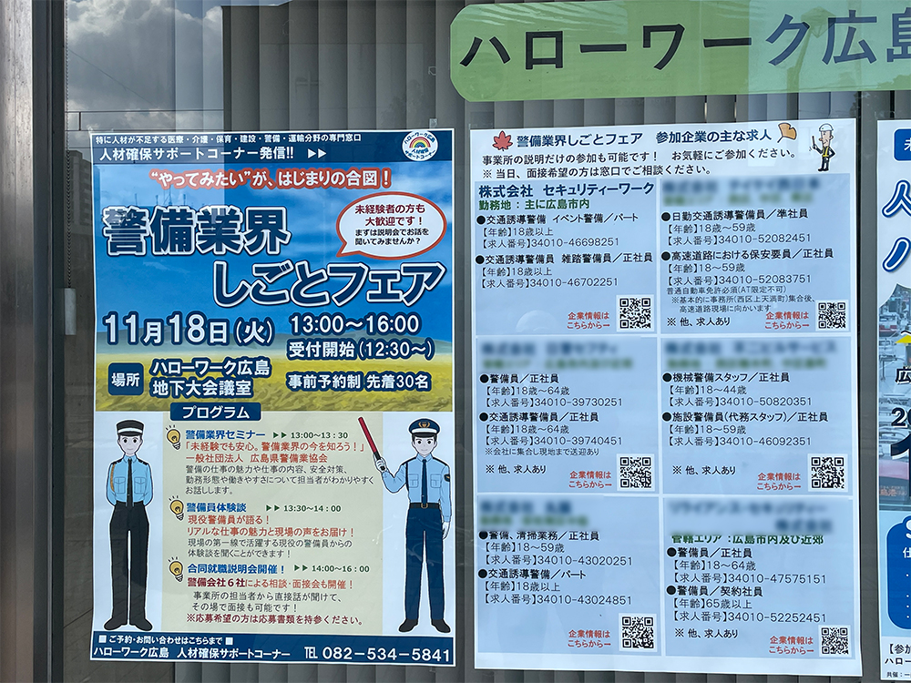 先日、ハローワーク広島にて開催された「警備業界 しごとフェア」に参加してきました。